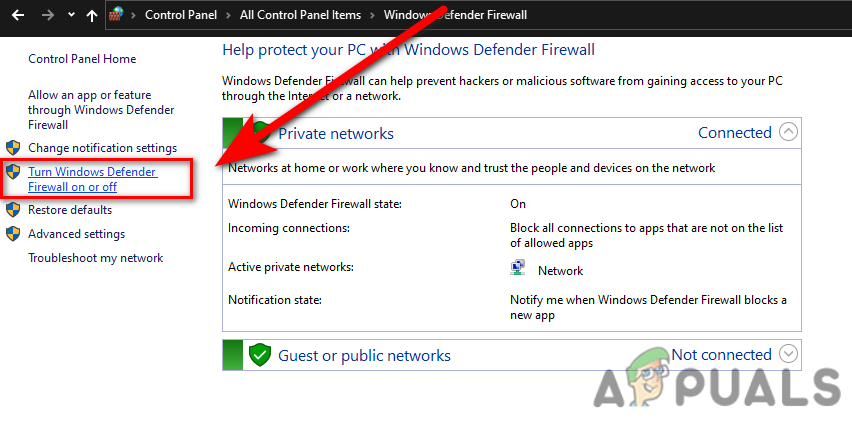 Turn Windows defender firewall on or off - Hit Yes if prompted.