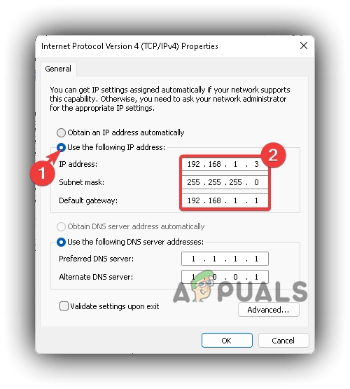 Opening Internet Protocol Version 4 (TCP IPv4) Properties - Turn on Use The Following DNS Server Addresses Manually; Insert either Google DNS (8.8.8.8 – 8.8.4.4) or Cloudflare DNS (1.1.1.1 – 1.0.0.1) and click OK.