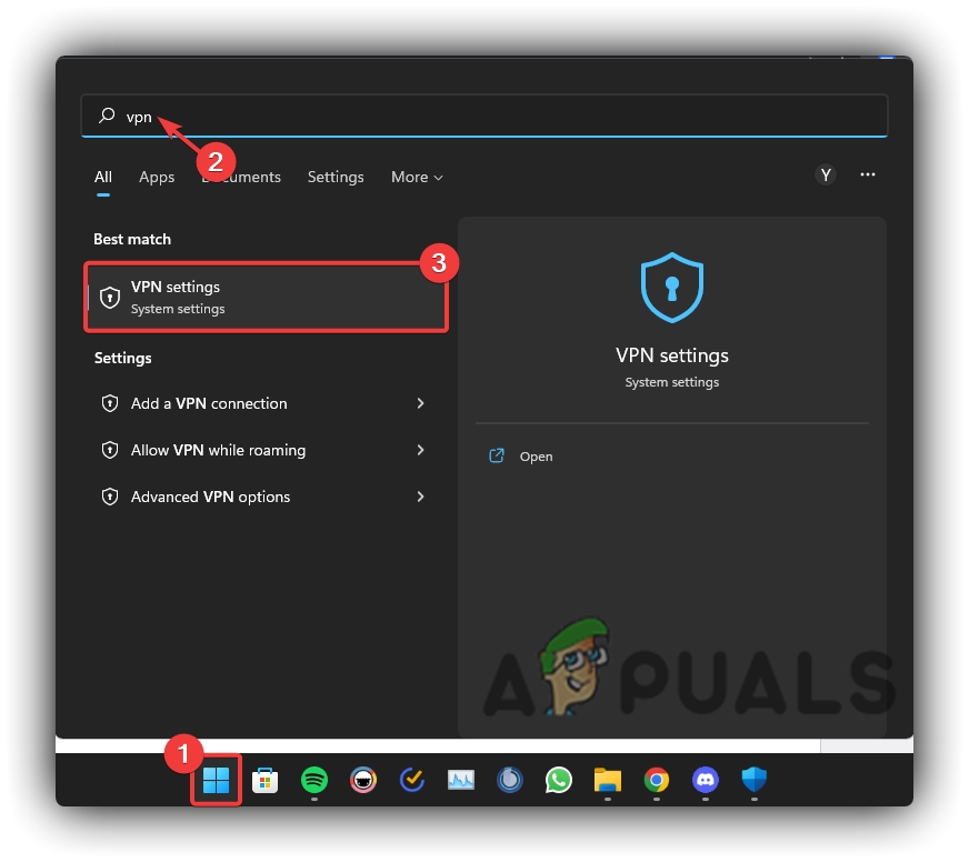 - Click on Start Menu, Type VPN Settings, and open it