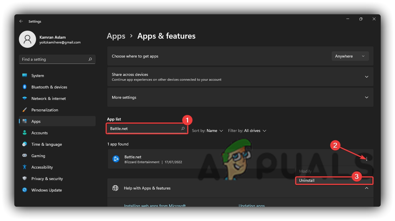 - Type Battle.net in the search bar and click on the three dots button and click Uninstall