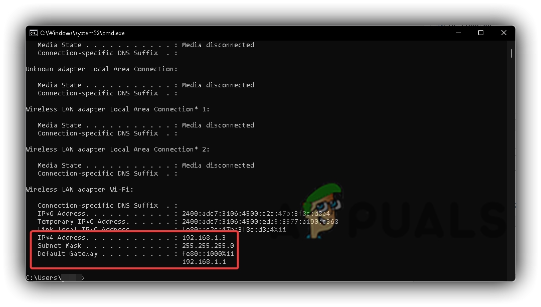 Windows Command Prompt IPCONFIG Addresses - Copy the IP Address, Subnet Mask, and Default Gateway into the Internet Protocol Version 4 (TCP/IPv4) properties, and press OK.
