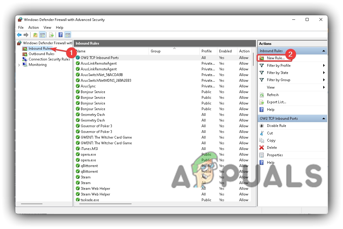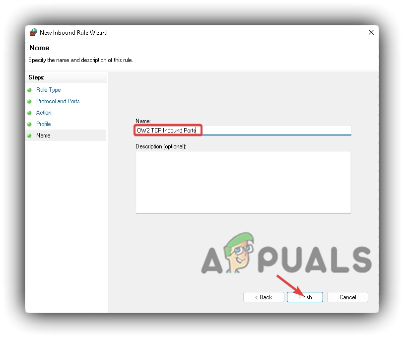 Windows Defender Firewall TCP Inbound Rule Name - Now go to the Outbound Rules, repeat the same process there, and name that OW2 TCP Outbound Ports.