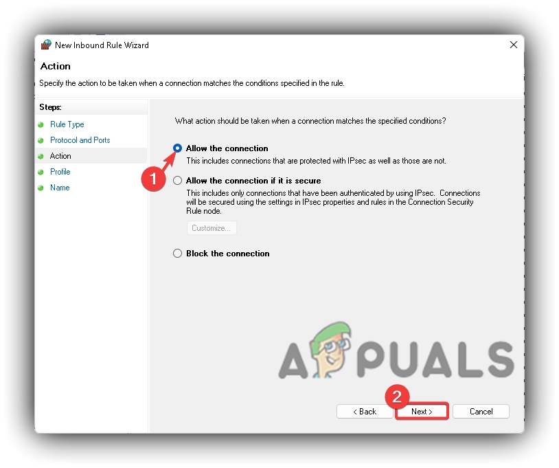 Windows Defender Firewall TCP Inbound Rule Ports - Tick Allow The Connection and press Next
