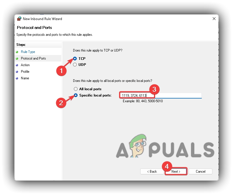 Windows Defender Firewall TCP Inbound Rule Type - Tick TCP, then tick Specified Local Ports, type the following ports: 1119, 3724, 6113, and press Next.