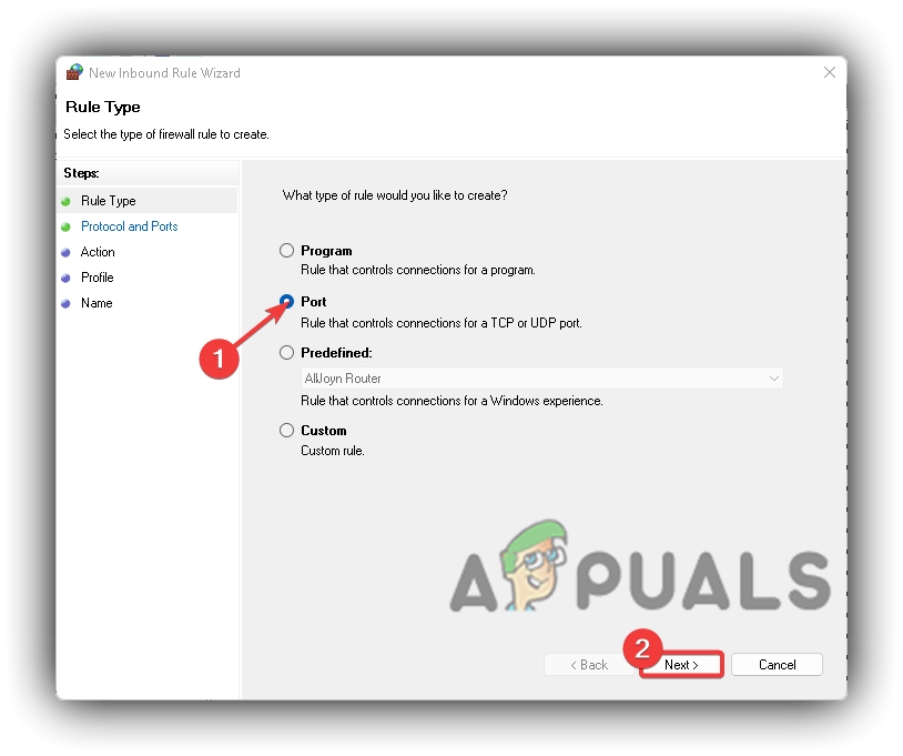 Windows Defender Firewall Inbound Rule To New Rule - Tick Port and click Next