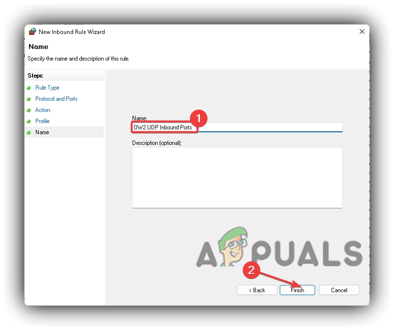 Windows Defender Firewall TCP Inbound Rule Profile - Name it OW2 UDP Inbound Ports and click Finish
