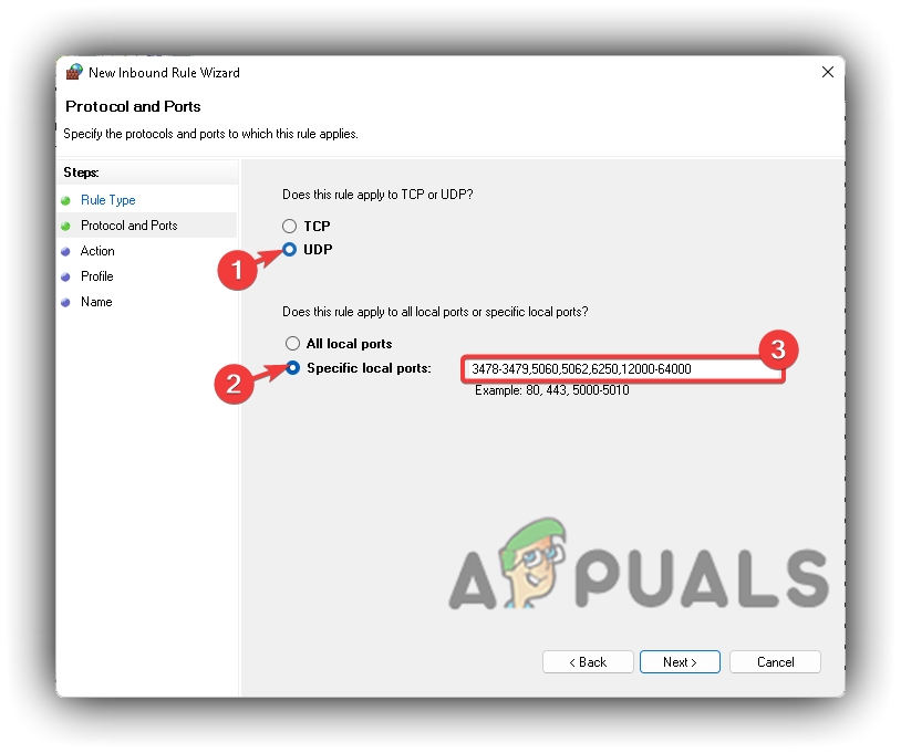 Windows Defender Firewall UDP Inbound Rule Name - Repeat the same process for Outbound UDP Ports as well.