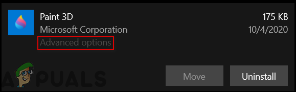 Paint 3D settings - Click on the application block that appears and click on Advanced Settings.