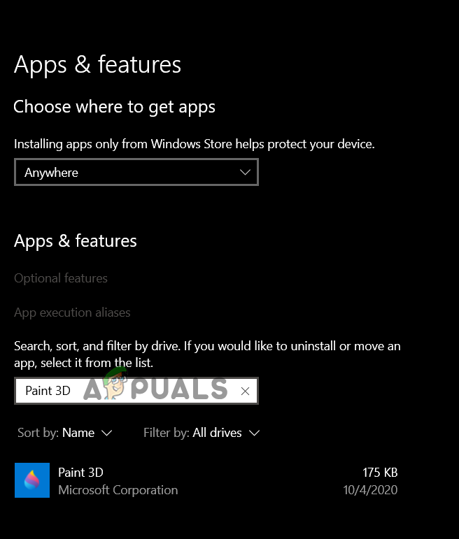 Apps and Features - Then, in the search bar type Paint 3D.