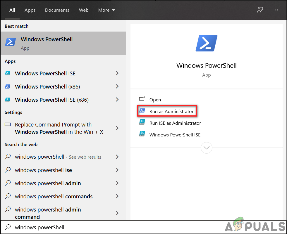 - First, press the Windows key and type in Windows PowerShell. Then, click on Run as Administrator.