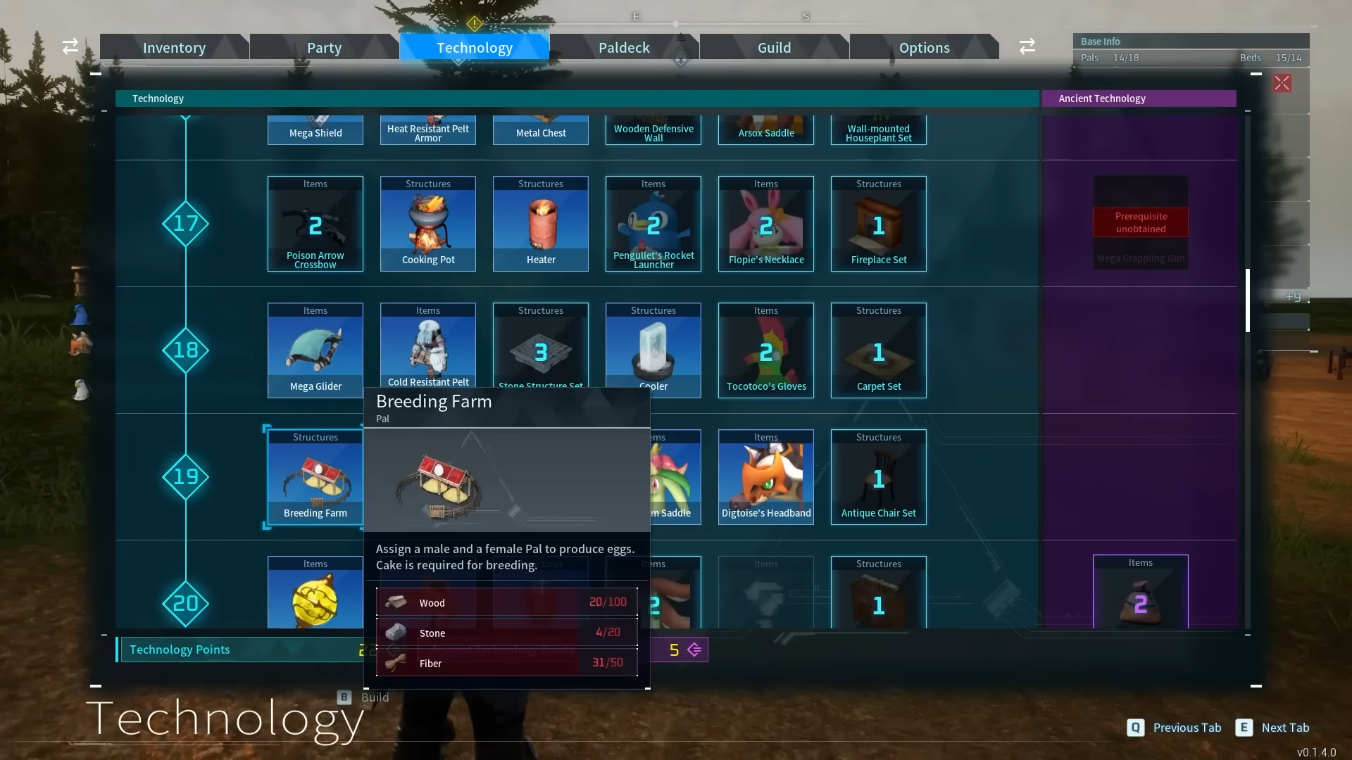 To start breeding in Palworld, you will first need to build a Breeding Farm. This will require you to hit Level 19 and 2 Technology Points which will unlock the breeding farm blueprint in the Technology menu. Once unlocked, you’ll need to following resources to complete your build: