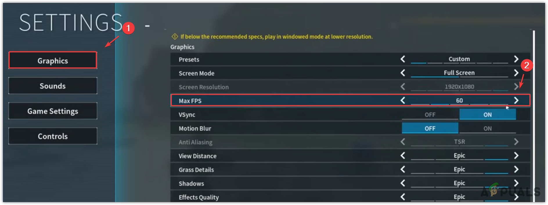 Games and applications often crash when they exhaust system resources. Therefore, even if your system is high-end, it’s advisable to lower the graphics settings in Palworld. This can prevent the game from utilizing extensive system resources and may help fix the issue.