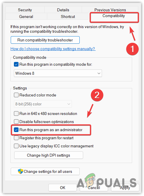 - In the Compatibility tab, check Run this program as an administrator.