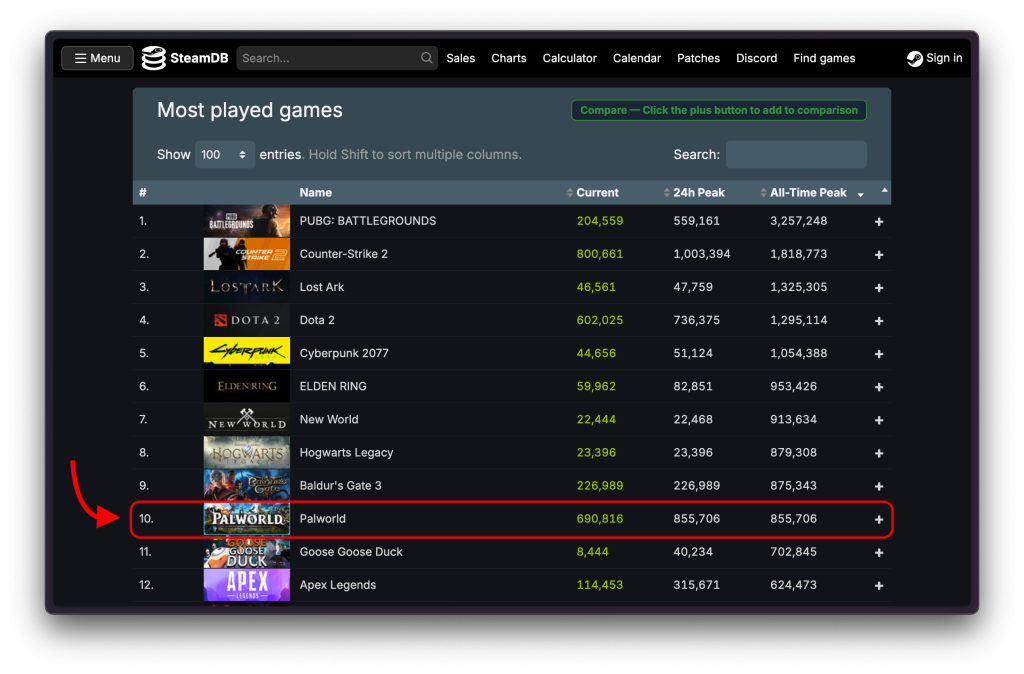 On Steam, the game reached over 850,000 concurrent players within a day of launch! To provide some context for what this number represents, Palworld has now become the 10th most played game of ALL TIME on Steam, and this is excluding console players.