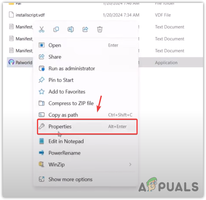 - Right-click on the Palworld shortcut and select Properties. If you lack a shortcut, navigate to the game’s installation directory and create one while holding the shift key.