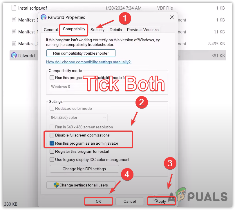 - Start Palworld to test if the issue remains. If it does, revisit the Compatibility settings, activate Run this program in compatibility mode, and select Windows 8 from the dropdown menu.