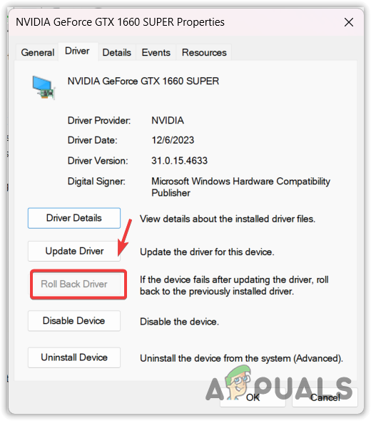 - Switch to the Driver tab and click on Roll Back Driver. If the option is grayed out, download an older GPU driver from the manufacturer’s website.