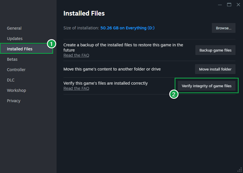 Running a verification check on your game files can resolve the issue. If any corrupted files are detected, they will be repaired automatically.
