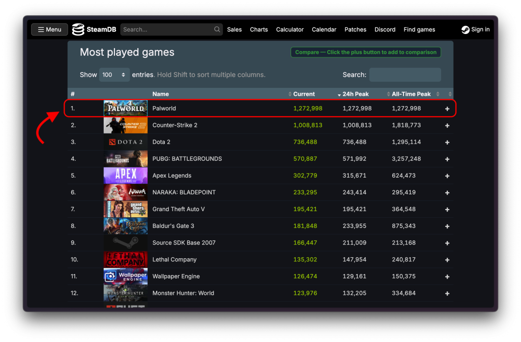 On Steam, the game climbed into the top-10 yesterday for the most concurrent players. As of the time of this writing, it has surpassed those records as well, reaching the 1st position. This makes it the #1 paid game with the most concurrent players on Steam alone, ranking 5th overall, behind popular titles such as PUBG and Valve’s CS2.