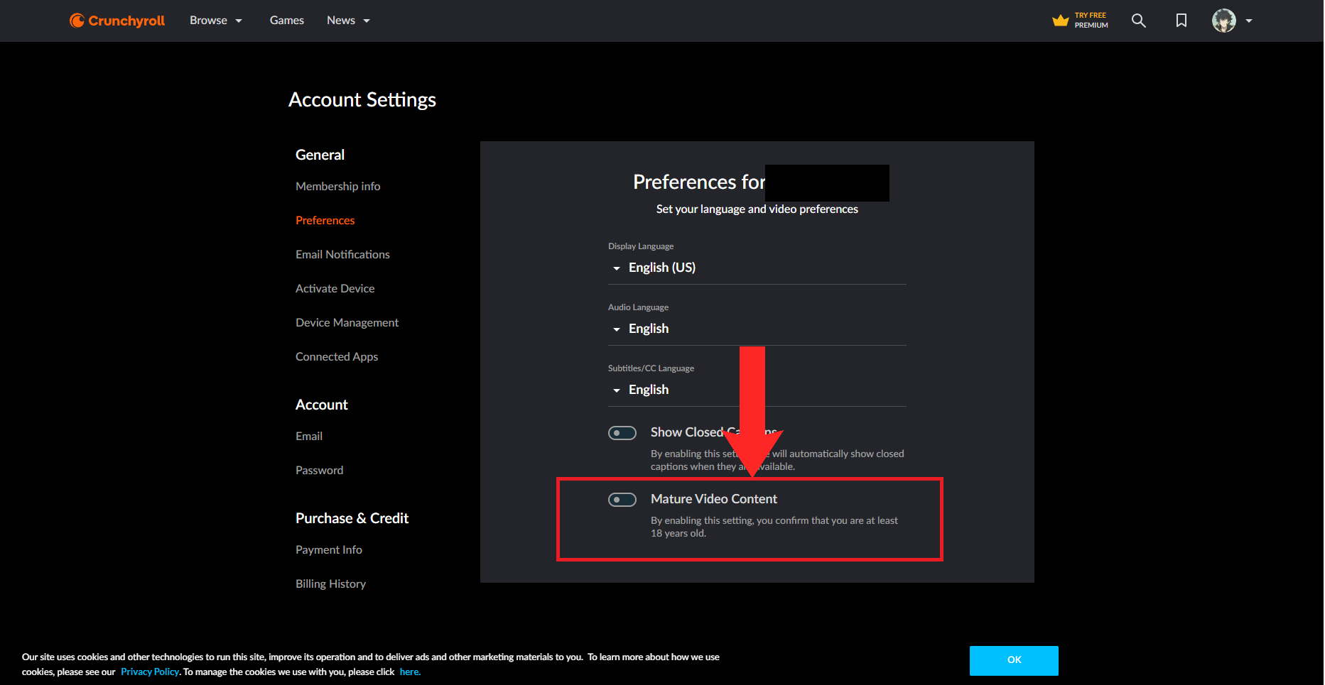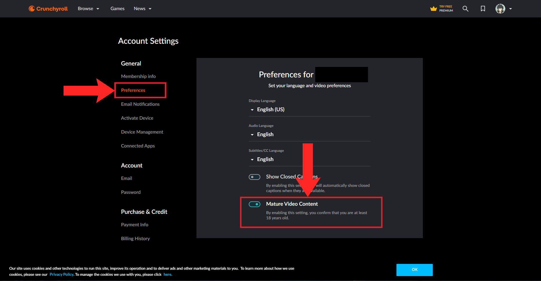 Click on “Settings” - In Settings, open up the Preferences section. You’ll see a switch for toggling Mature Video Content. If it is switched on, as shown below, click on it. If it is switched off, parental controls are active for your Crunchyroll account.