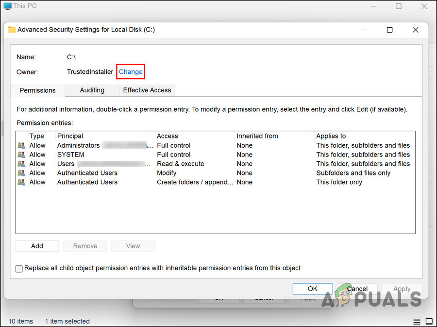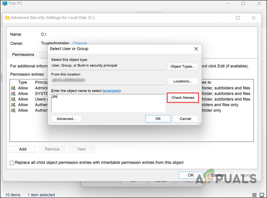 Click on the Change hyperlink - In the Select User or Group dialogue, enter your username and click Check Name > Modify the ownership.
