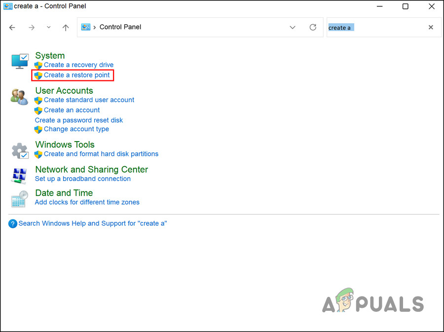 - Select Create a restore point in the Control Panel window.