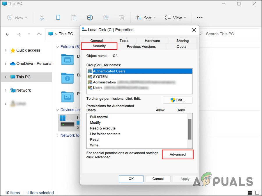 Choose Properties from the context menu - In the following window, head to the Security tab and click on the Advanced button.
