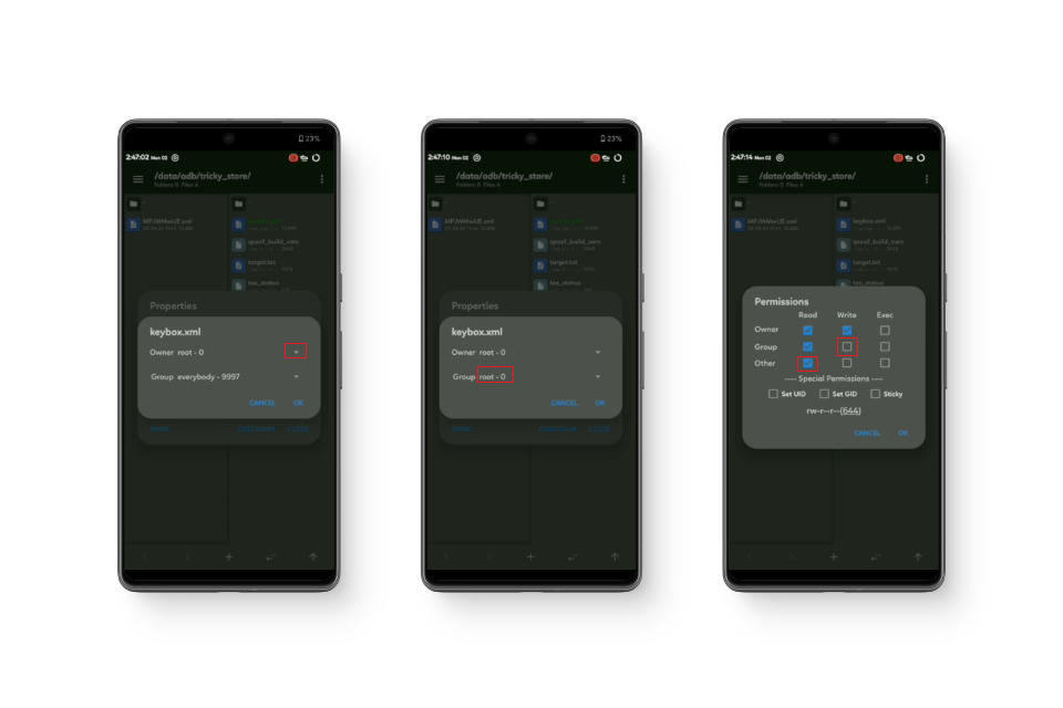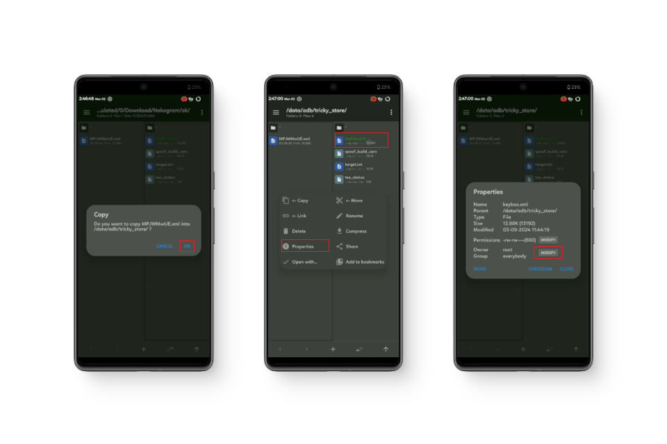 <em>/data/adb/tricky_store/</em>and paste the file there. - Long tap on the keybox file, and go to properties.