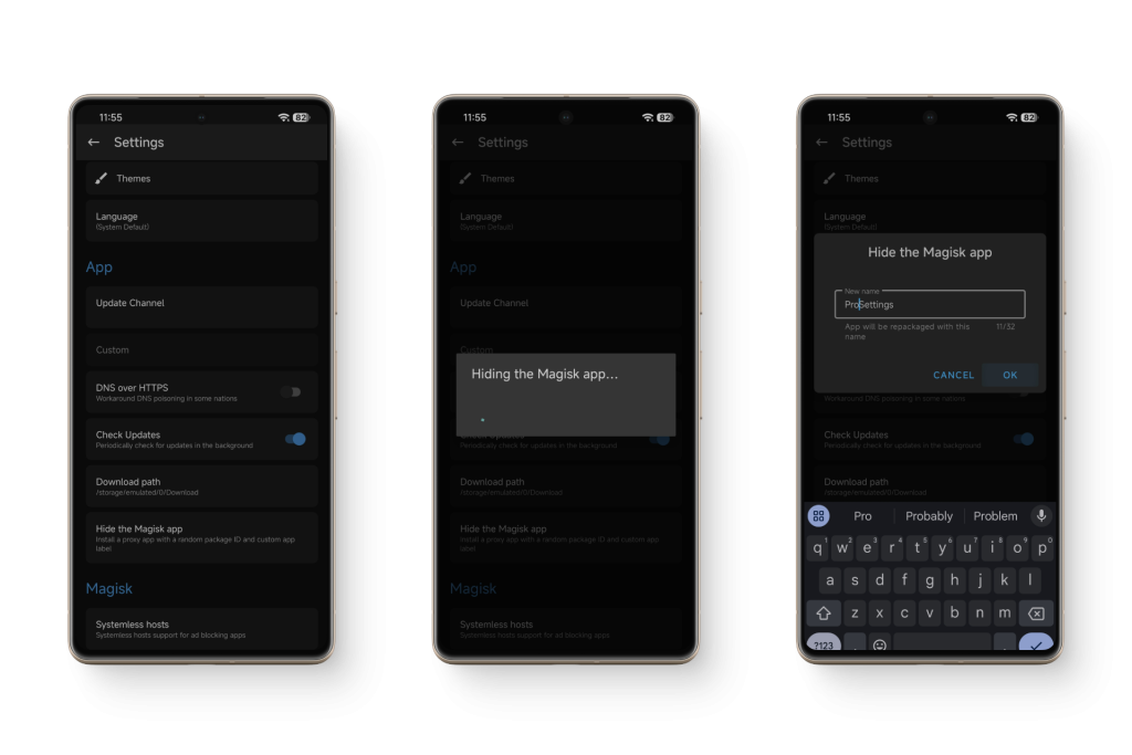 The first plan of action is to hide the Magisk app itself. Some services access the list of installed apps on the phone, and if they find Magisk, they use that information to extrapolate that the device is modified. Magisk allows you to replace itself with a proxy app with a random package ID.