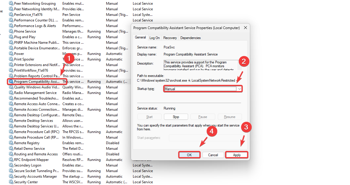 Another cause that could lead to this issue is the stopped PcaSvc service. This service monitors and detects compatibility issues with installed programs. Therefore, ensure this service is running.