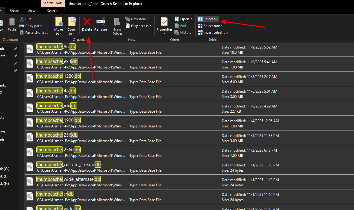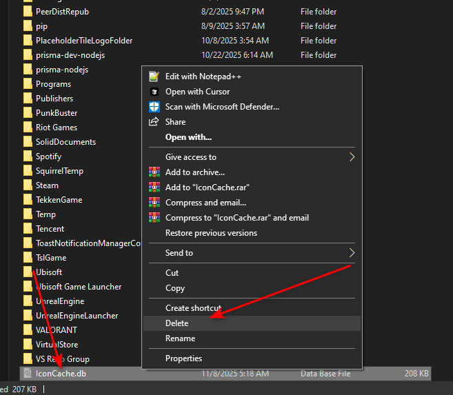 A damaged cache often prevents Windows from displaying proper thumbnails. Deleting the icon cache removes all corrupted entries and forces Windows to rebuild fresh versions automatically, fixing the black icon issue.