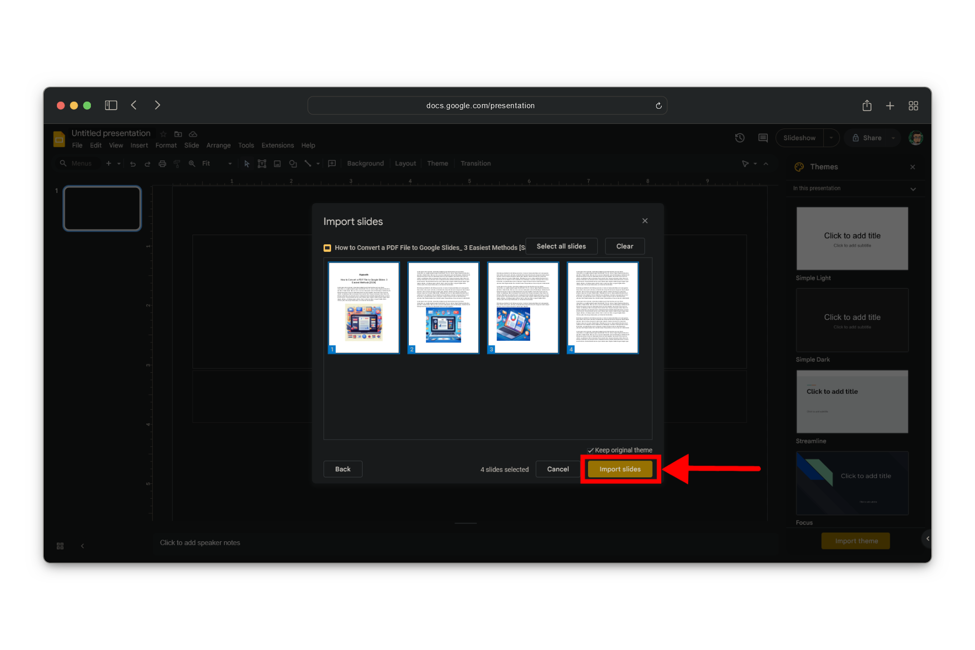 Select the slides you want to add to your presentation - Click “Import slides” to add them to your presentation.