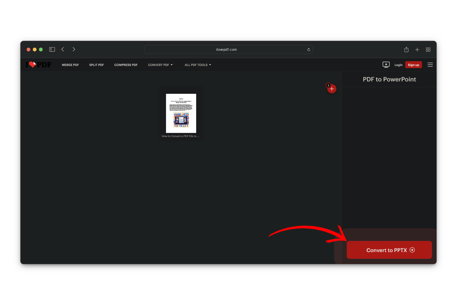 Select and upload the PDF file you want to convert - Once the PDF is uploaded, click the “Convert to PPTX” button to initiate the conversion process.