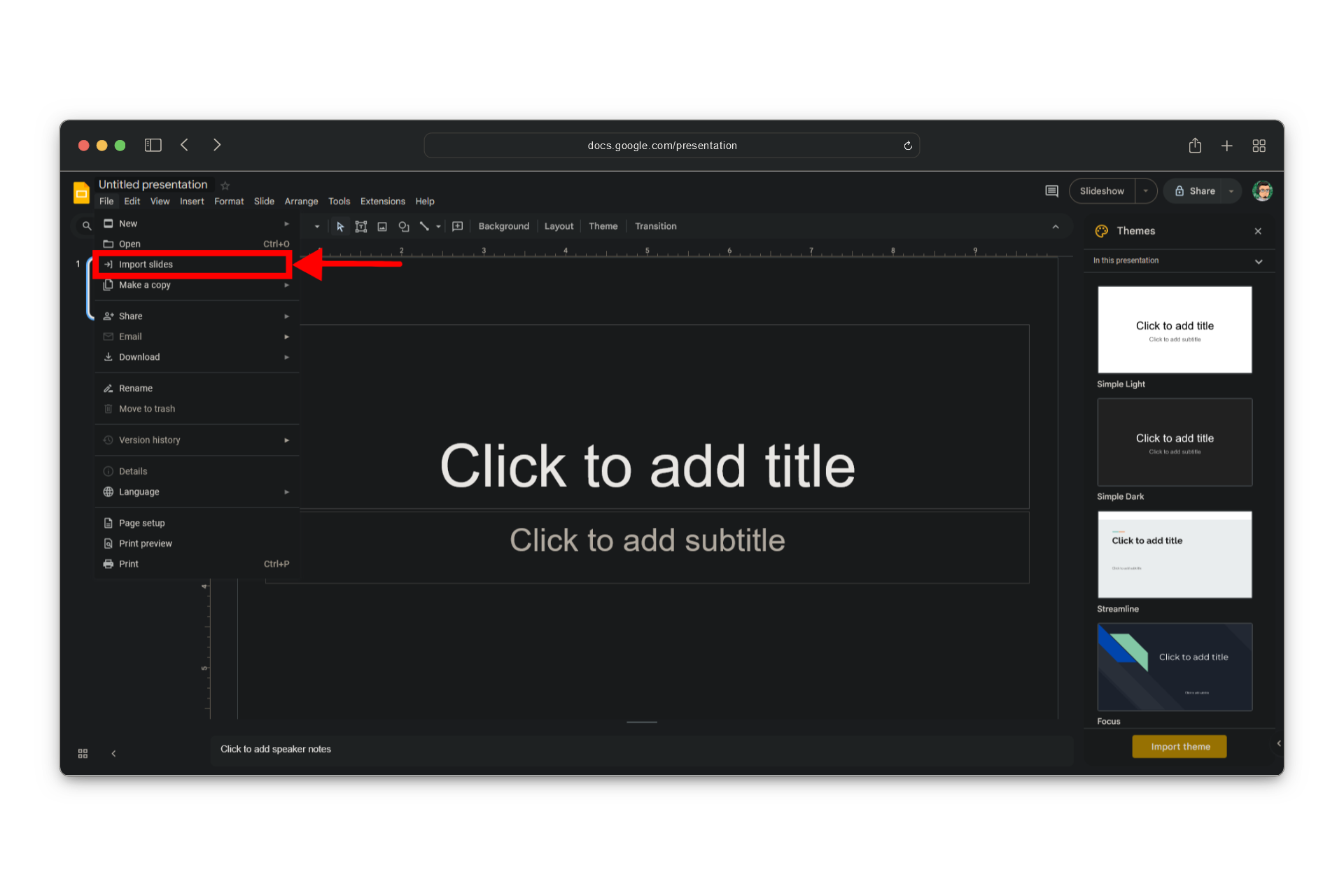 Create Blank Presentation - On the top left corner, click File > Import slides.