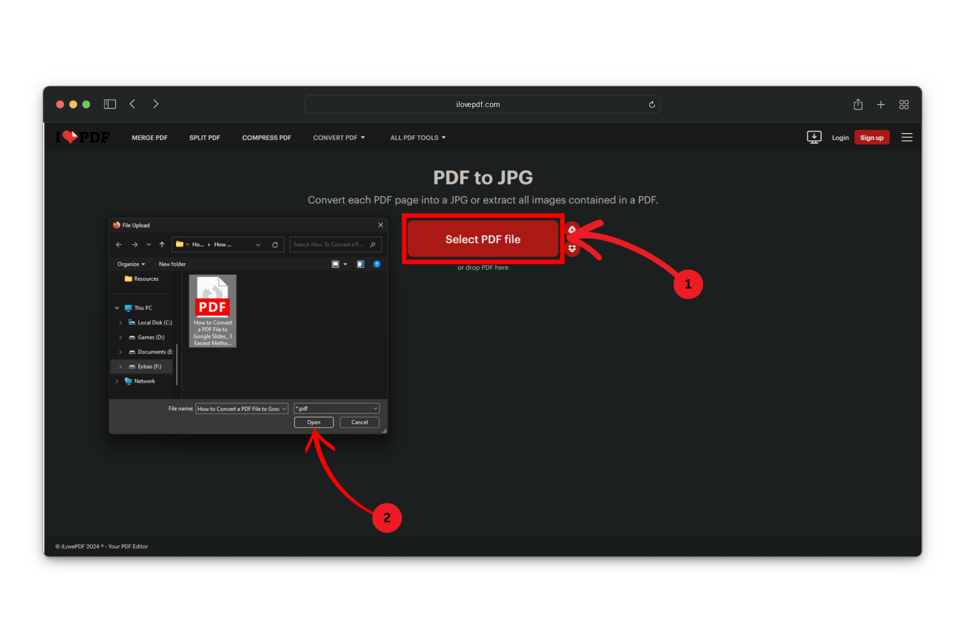 Select “PDF to JPG” - Click the “Select PDF file” button to upload the PDF you wish to convert. You can also drag and drop the file directly onto the webpage.