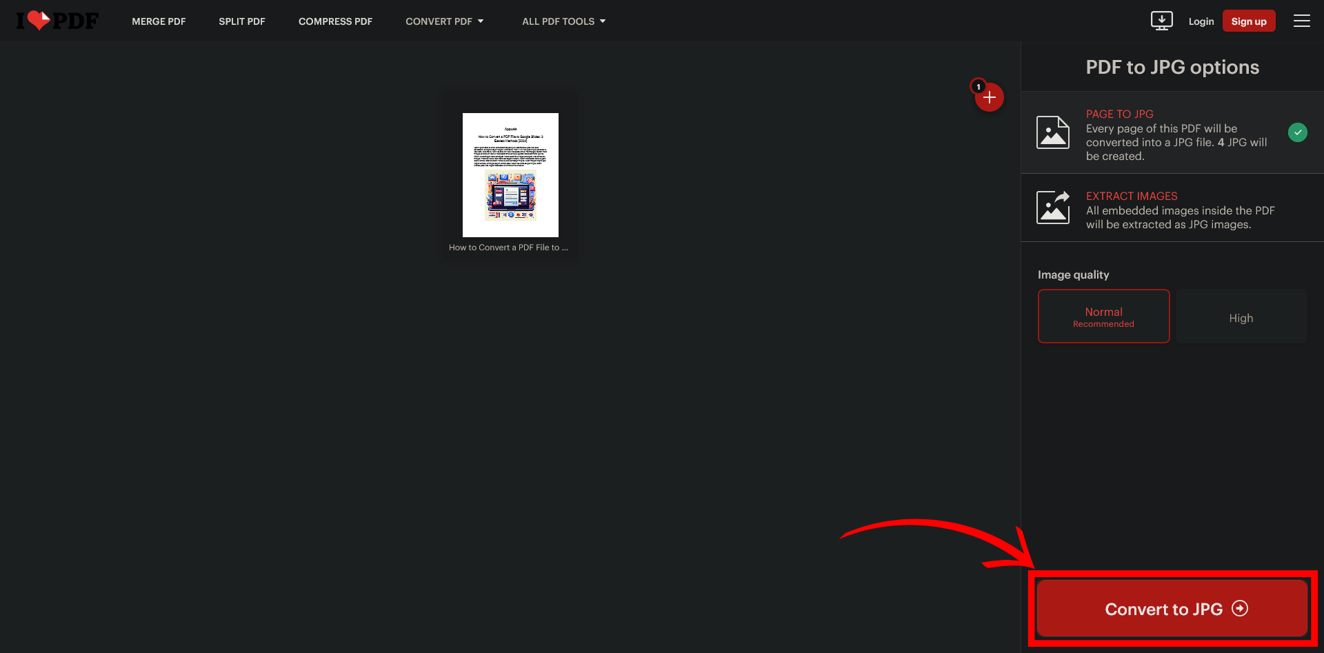 Select and upload the PDF file you want to convert - Once the PDF is uploaded, choose the “Page to JPG” option to convert every page of your PDF to a JPG file. You can also adjust the image quality and size if you want.