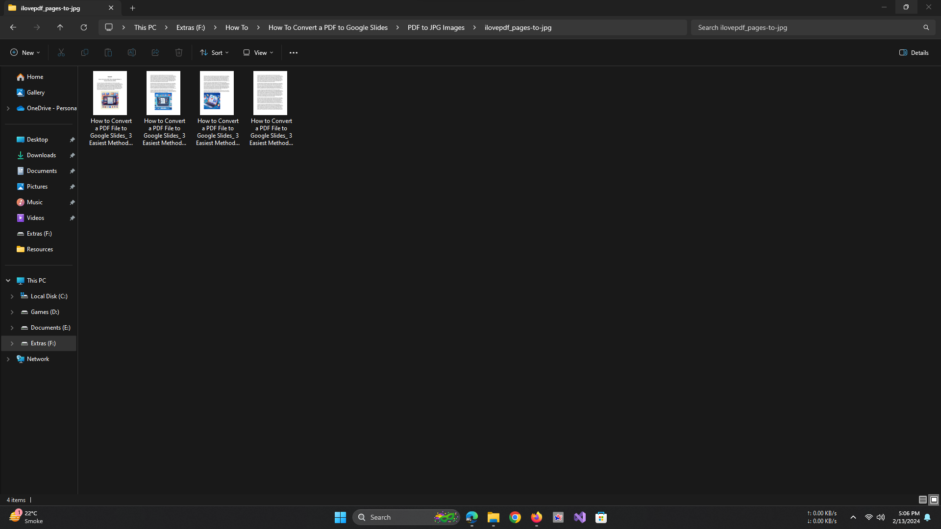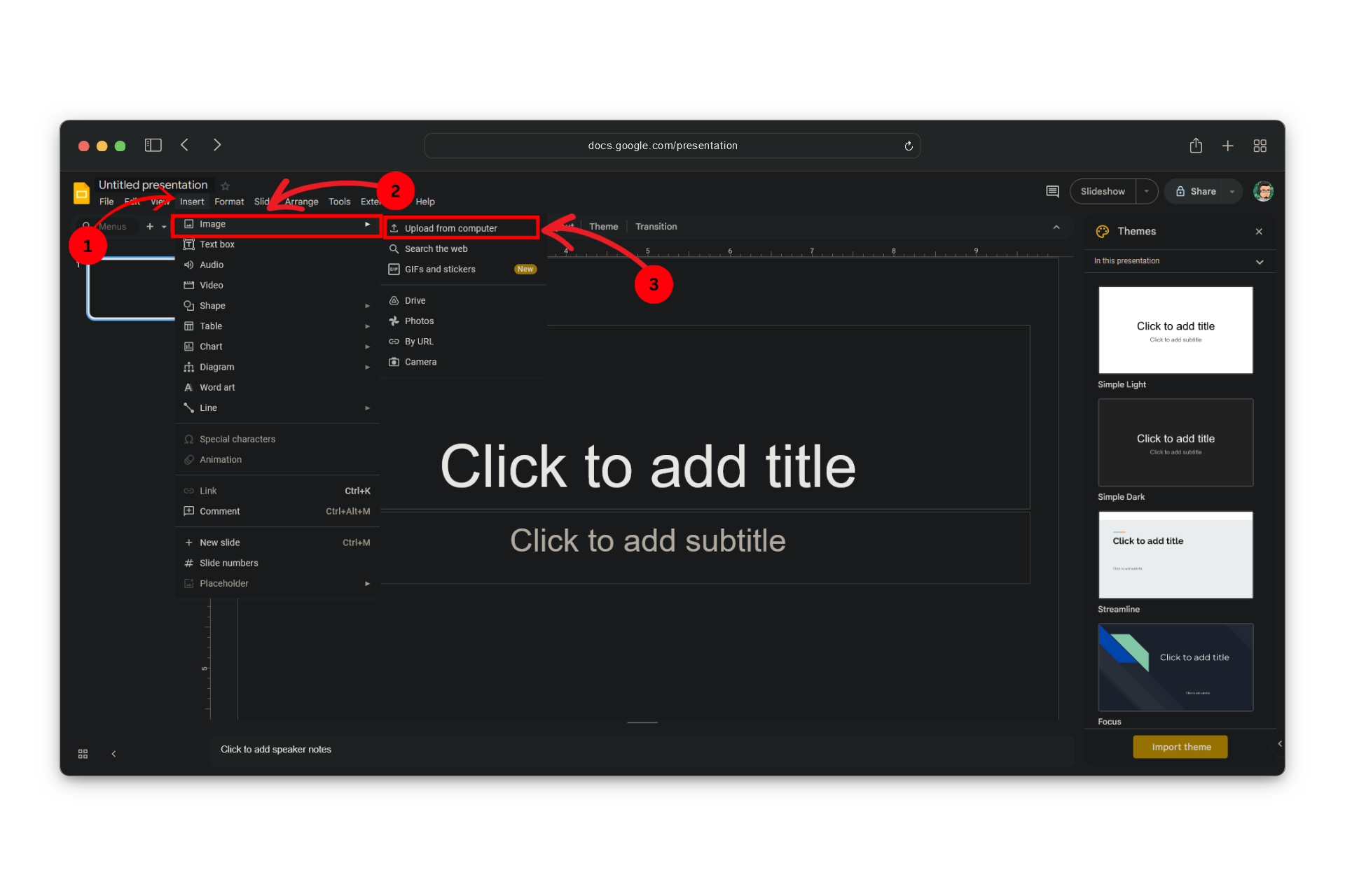 The images that have been extracted will appear in the location you selected - Now, open your Google Slides presentation and click Insert > Image > Upload from computer.