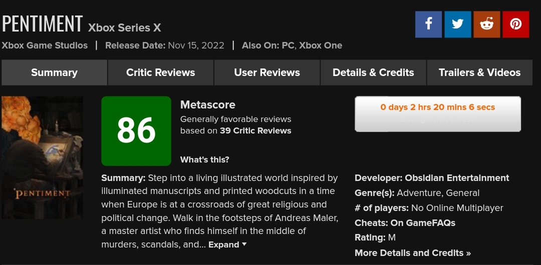 The reviews of Pentiment are also out, and the critics appreciate the game for its visuals and intriguing storyline. And the variety the game holds regarding its consequences as your choice will decide the ending for Andreas Maler. Below is a summary of the scores significant media outlets gave Pentiment.