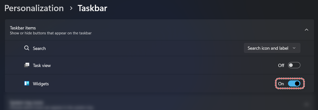 - Toggle off Widgets. This action will fully remove the widget menu from the taskbar.