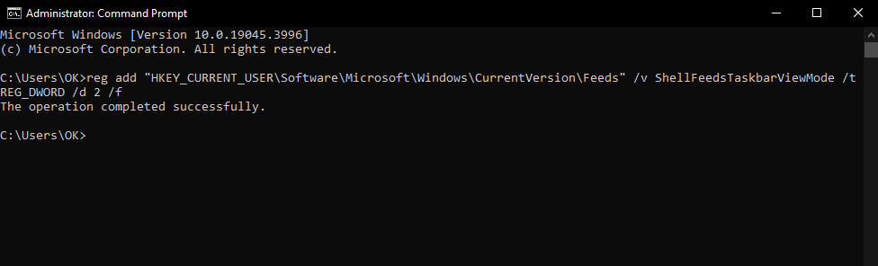 reg add "HKEY_CURRENT_USER\Software\Microsoft\Windows\CurrentVersion\Feeds" /v ShellFeedsTaskbarViewMode /t REG_DWORD /d 2 /f