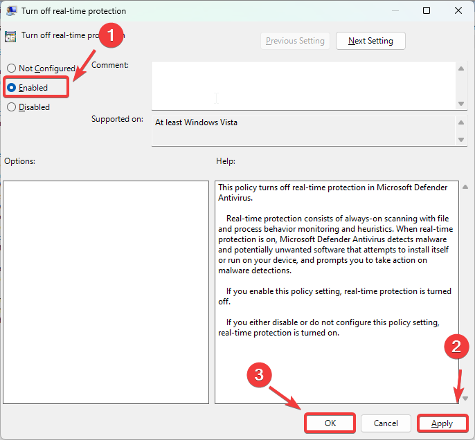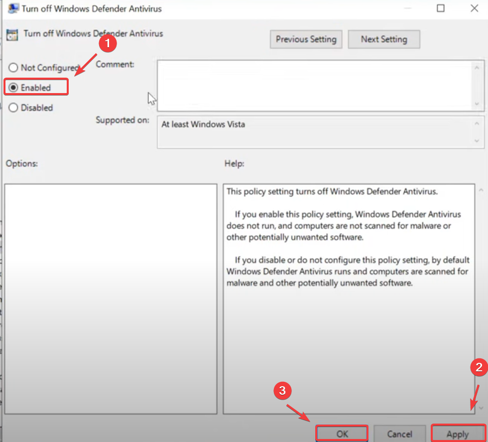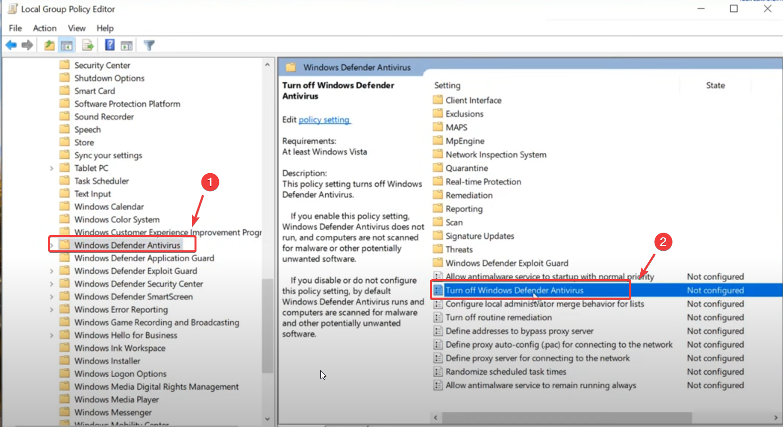 - Double-click Turn off Microsoft Defender Antivirus, then select Enabled.