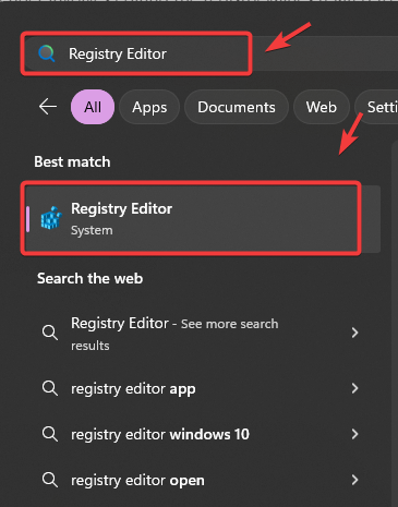 - Click the Start Menu and type Registry Editor, then press Enter to open it.