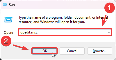 - In the Run Dialog box, type gpedit.msc and press Enter to open the Group Policy Editor.