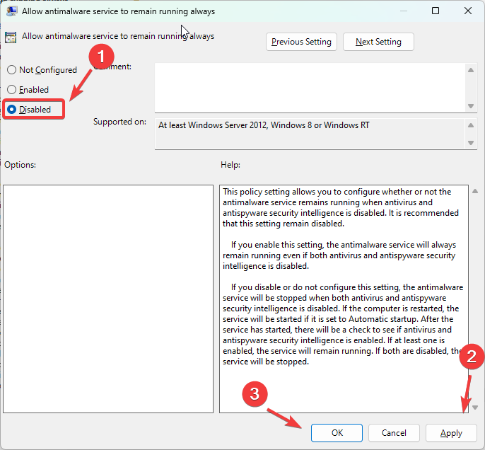 - Next, select Allow Antimalware service to remain running always, and set it to Disabled.