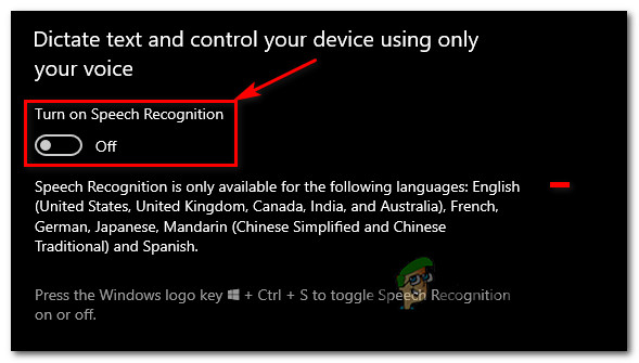 - Once you’re inside the Speech tab, move over to the right-hand side method and check if Speech Recognition is enabled. If it’s not enabled, change the associated toggle to ON.