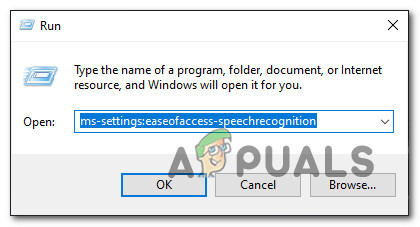 - Press Windows key + R to open up a Run dialog box. Next, type ‘ms-settings:easeofaccess-speechrecognition’ and press Enter to open up the Speech tab of the Settings app.