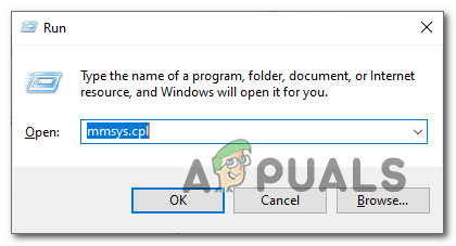 - Start by pressing Windows key + R to open up a Run dialog box. Then, type “mmsys.cpl” and press Enter to open up the Sound menu of the Settings app.