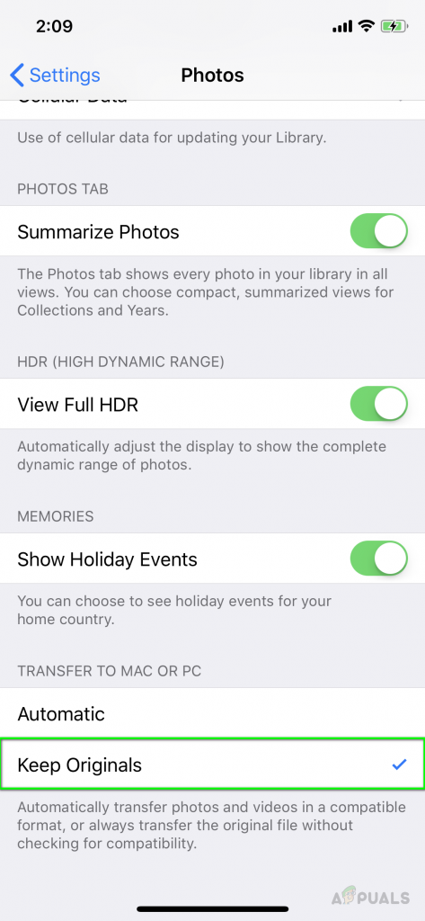 In this method, we will change the Photos settings of the iPhone device. This method has reported to have worked for a lot of users. iPhone has the option where you can choose to keep the original files on your device while transferring them to a PC or MAC. This option is disabled by default. All you have to do is change it so that the original photos are retained on the device. Please see the steps below: