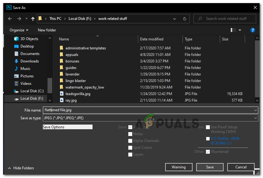 Using the Save As function in Photoshop - Inside the Save As window, select a suitable location where you can save the flattened file, name it whatever you want but ensure that you change the Save as type to .JPEG or .PNG.