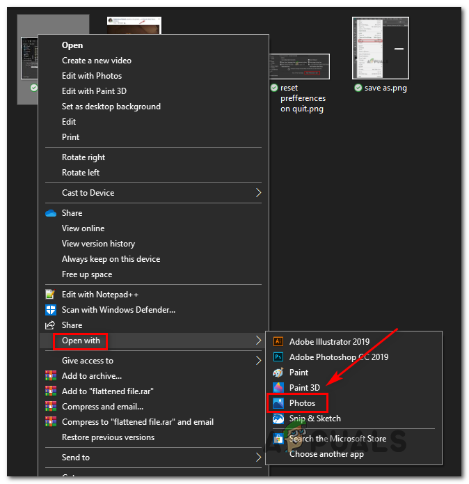 Accessing the Flattened File - Once the file has been successfully saved, you can close your Photoshop application and navigate to the location where you saved the flattened file. Next, right-click on it and choose Open with > Photos from the newly appeared context menu.